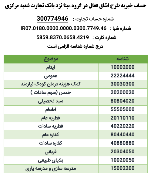 خیّر گرامی ؛ علاوه برمبلغ اهدائی ، کارمزد بانکی نیز از حساب شما کسر خواهد شد.